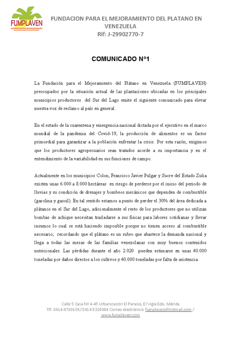Por su parte, la Fundación para el Mejoramiento del Plátano en Venezuela (FUMPLAVEN) expresó su preocupación por la situación actual de las plantaciones e indicó que las pérdidas durante este año 2020 pueden estimarse en unas 40.000 toneladas por daños directos a los cultivos y 40.000 toneladas por falta de asistencia.