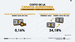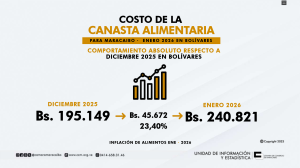 % frente al mes anterior. Esta alza, confirma la aceleración inflacionaria del rubro alimentos en bolívares cuya variación interanual —entre febrero de 2025 y enero de 2026— alcanzó los 750,17 %.