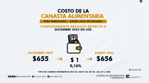 Al evaluar el costo de la Canasta Alimentaria Normativa en dólares estadounidenses, el estudio evidencia una variación leve ya que durante el mes investigado, el costo total de la canasta se ubicó en 656 dólares; registrando un aumento mensual de 0,16 % calculado con base en el tipo de cambio de referencia del Banco Central de Venezuela al 30 de enero de 2026 el cual se fijó en Bs. 367,31 por dólar.