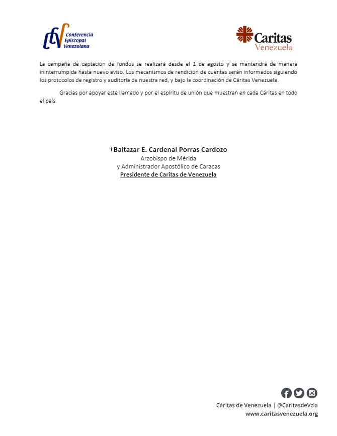 Cáritas de Venezuela hace un llamado a la sociedad de buena voluntad, empresas privadas y todas aquellas organizaciones que quieran colaborar con la compra de estos insumos a realizar sus aportes.