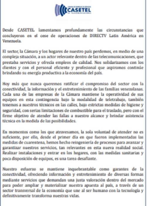 La Cámara de Empresas de Servicios de Telecomunicaciones (Casetel), lamentó las circunstancias que concluyeron en el cese de operaciones de DIRECTV Latin América en Venezuela