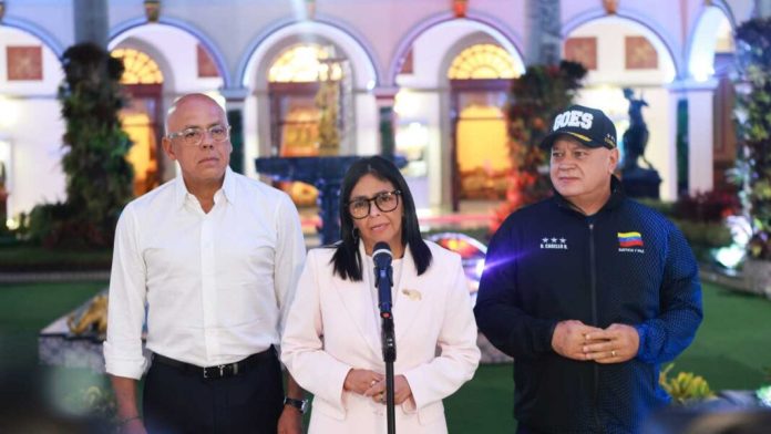 Rodríguez ofreció declaraciones desde el Palacio de Miraflores a un mes de los acontecimientos sucedidos el 3 de enero, y estuvo acompañada por el presidente de la Asamblea Nacional, Jorge Rodríguez, y el ministro de Interior, Diosdado Cabello.