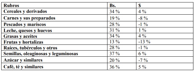 A continuación, se presentan una lista de los rubros estudiados, clasificados en grupos alimenticios, con sus respectivas variaciones de precios expresados en porcentajes: