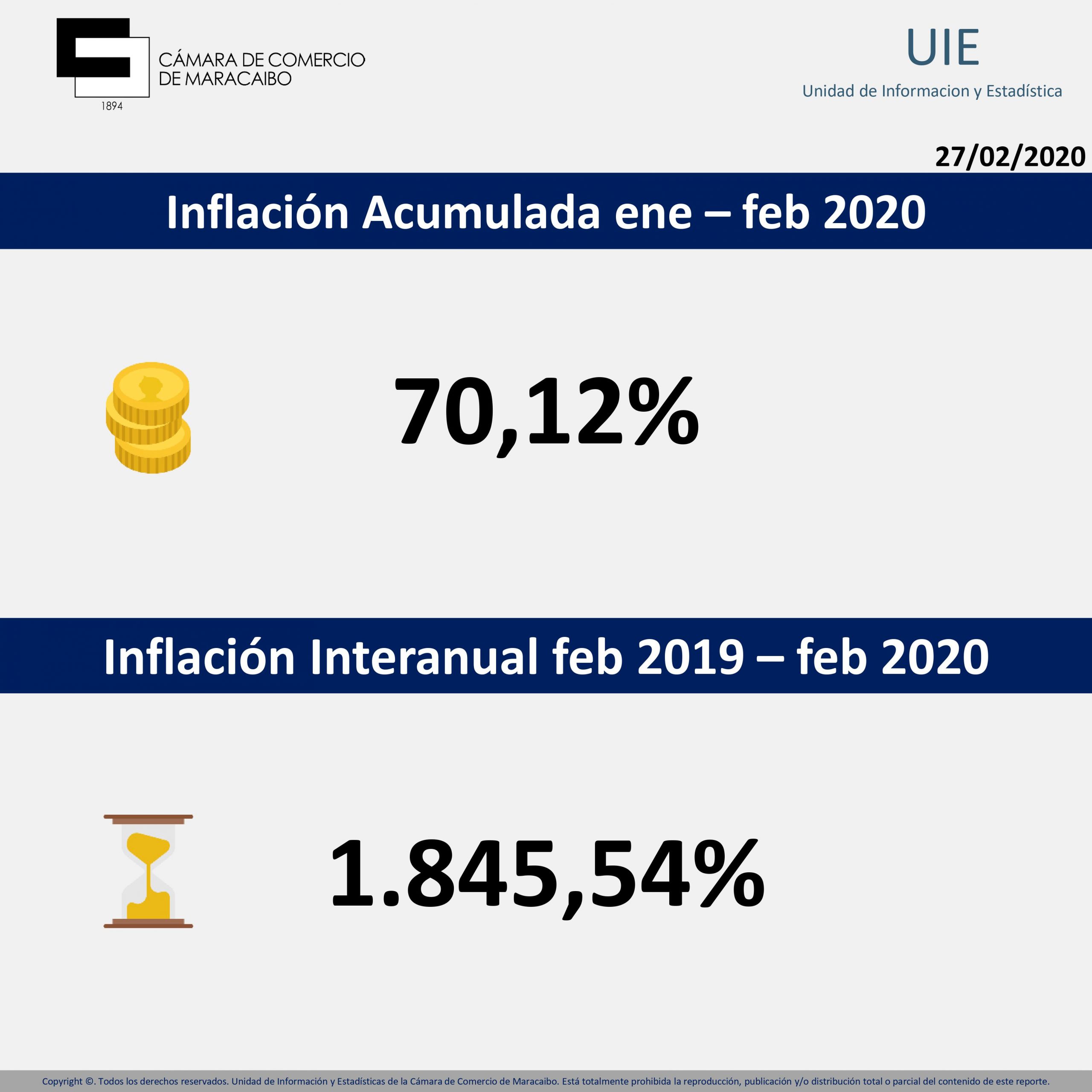En este sondeo, se fijó en 10,59% la inflación de alimentos durante el segundo mes del año en curso, mientras que la inflación acumulada (enero–febrero 2020) se estableció en 70,12%. Y la inflación interanual (feb 2019 – feb 2020), quedó en 1.845,54%.