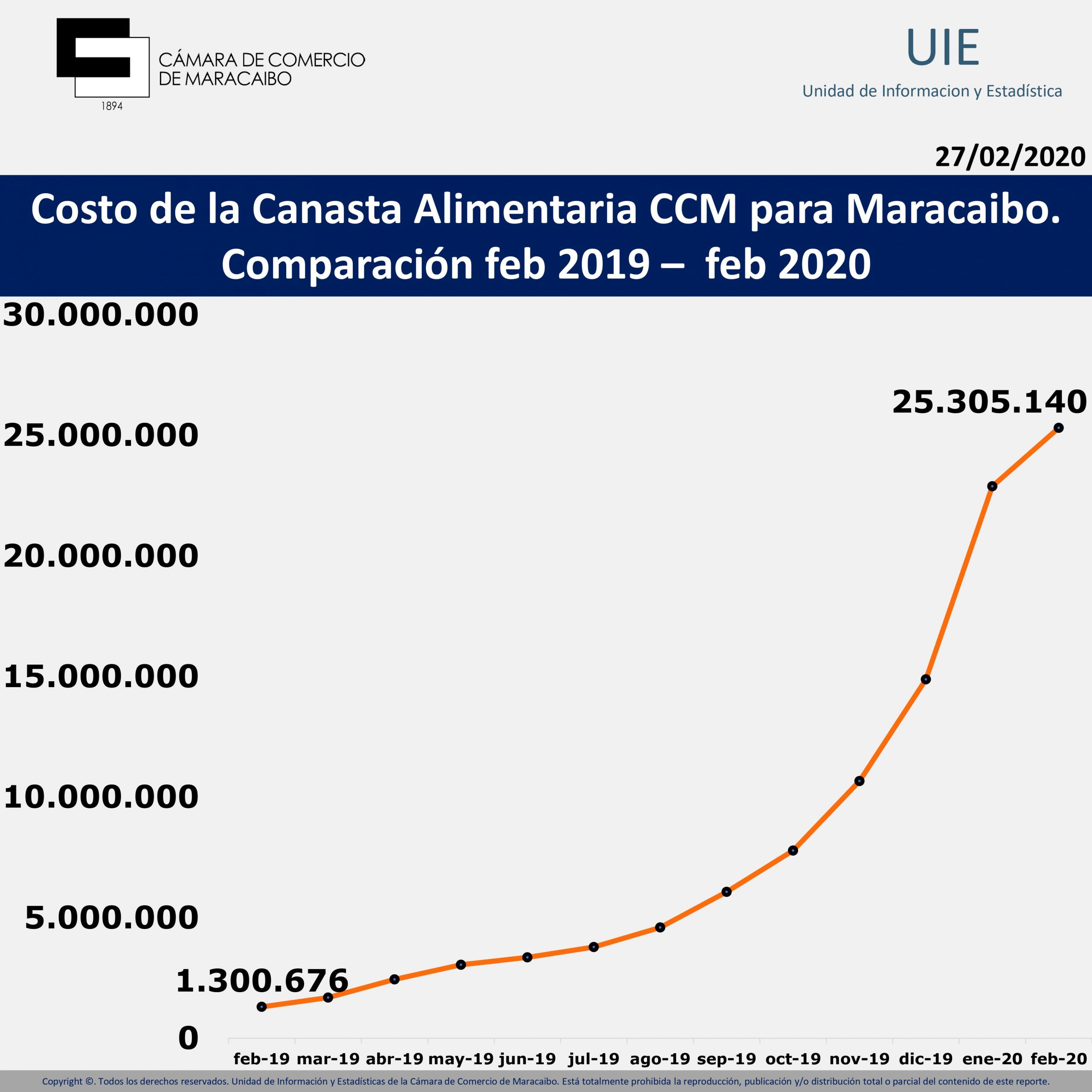 Solo en la capital del estado Zulia, el costo de la Canasta Alimentaria CCM se ubicó en el primer mes de 2020 en Bs. 22.881.067 (equivalentes a $309) calculado al tipo de cambio oficial de Banco Central de Venezuela (BCV) con fecha del 31/01/2020.