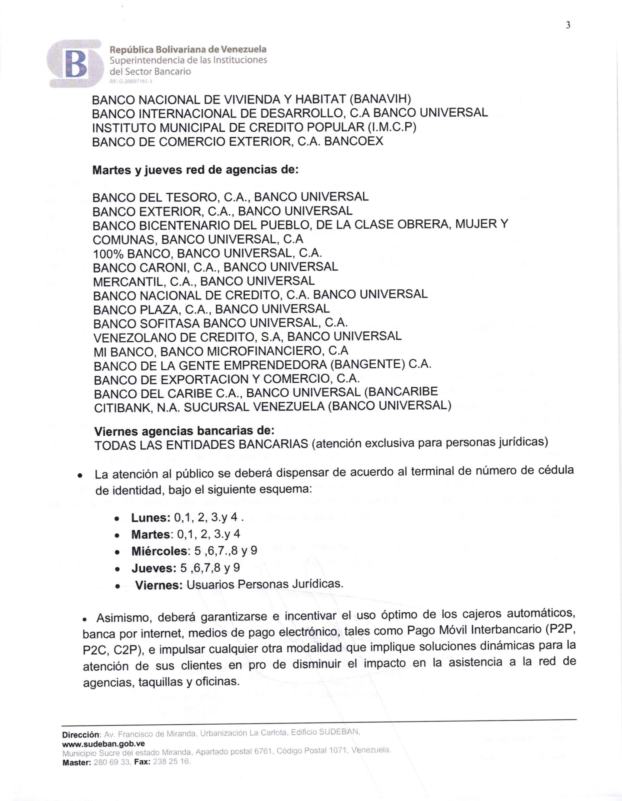 En una circular de fecha 7 de junio la Superintendencia de las Instituciones del Sector Bancario SUDEBAN informó que se suman al plan de cuarentena obligatoria y programada.