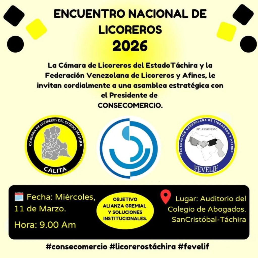 La directiva nacional de la Federación Venezolana de Licoreros y Afines (Fevelif), junto a la Cámara de Licoreros del Táchira y varios empresarios del rubro, celebrarán este 11 de marzo un encuentro nacional. El evento tendrá lugar en el auditorio del Colegio de Abogados del Táchira y comenzará a las 9 de la mañana.