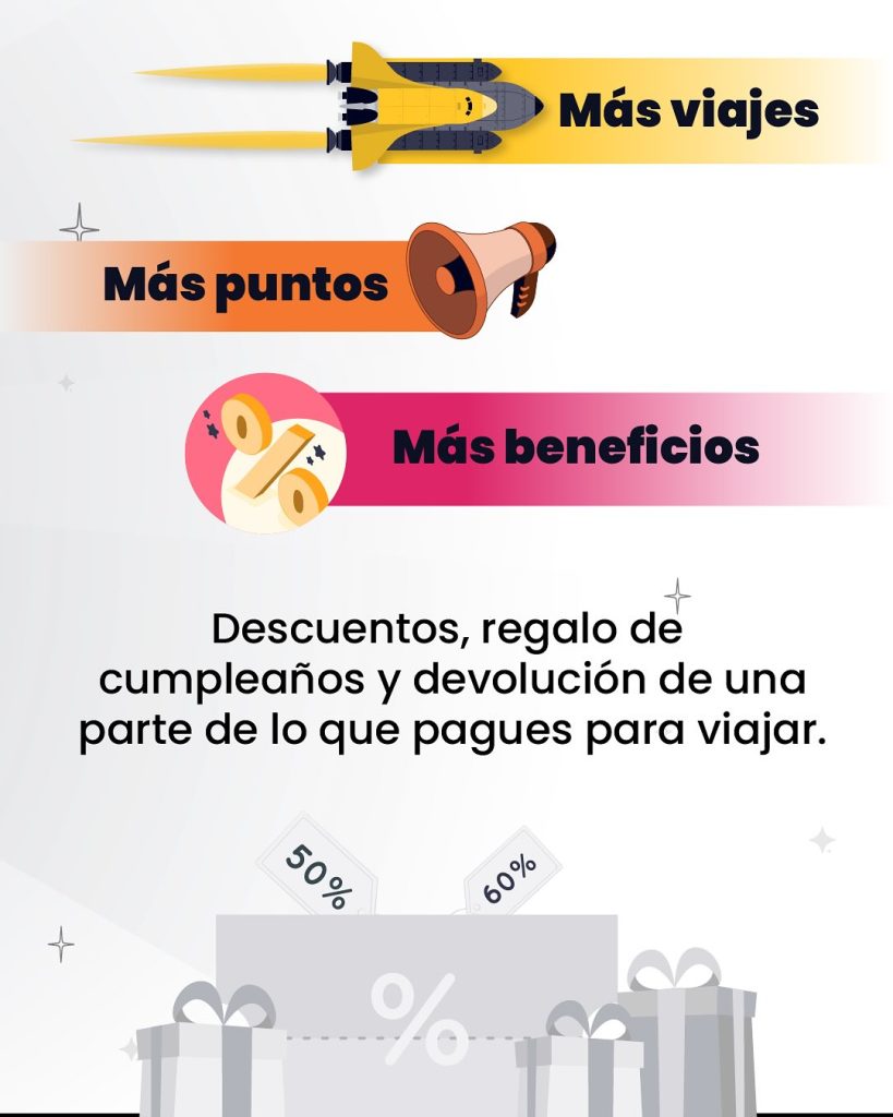- Embajador (40.000 puntos): Incluye 15% de descuento en dos viajes, $1 de descuento en viajes, 20% de descuento en su cumpleaños y 7% de Cashback.