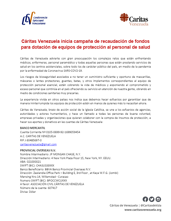Cáritas de Venezuela inicia una campaña de recaudación de fondos para dotar al personal de salud con equipos de protección.