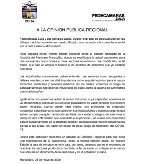 Por esa razón, hicieron un llamado al gobierno regional para que inicie una modificación de la cuarentena, debido a que la tasa de contagio en la entidad es muy baja y consideran que es el momento de reactivar los sectores productivos, a fin de evitar un colapso en el sector que solo iría en detrimento de la economía y de la población zuliana.